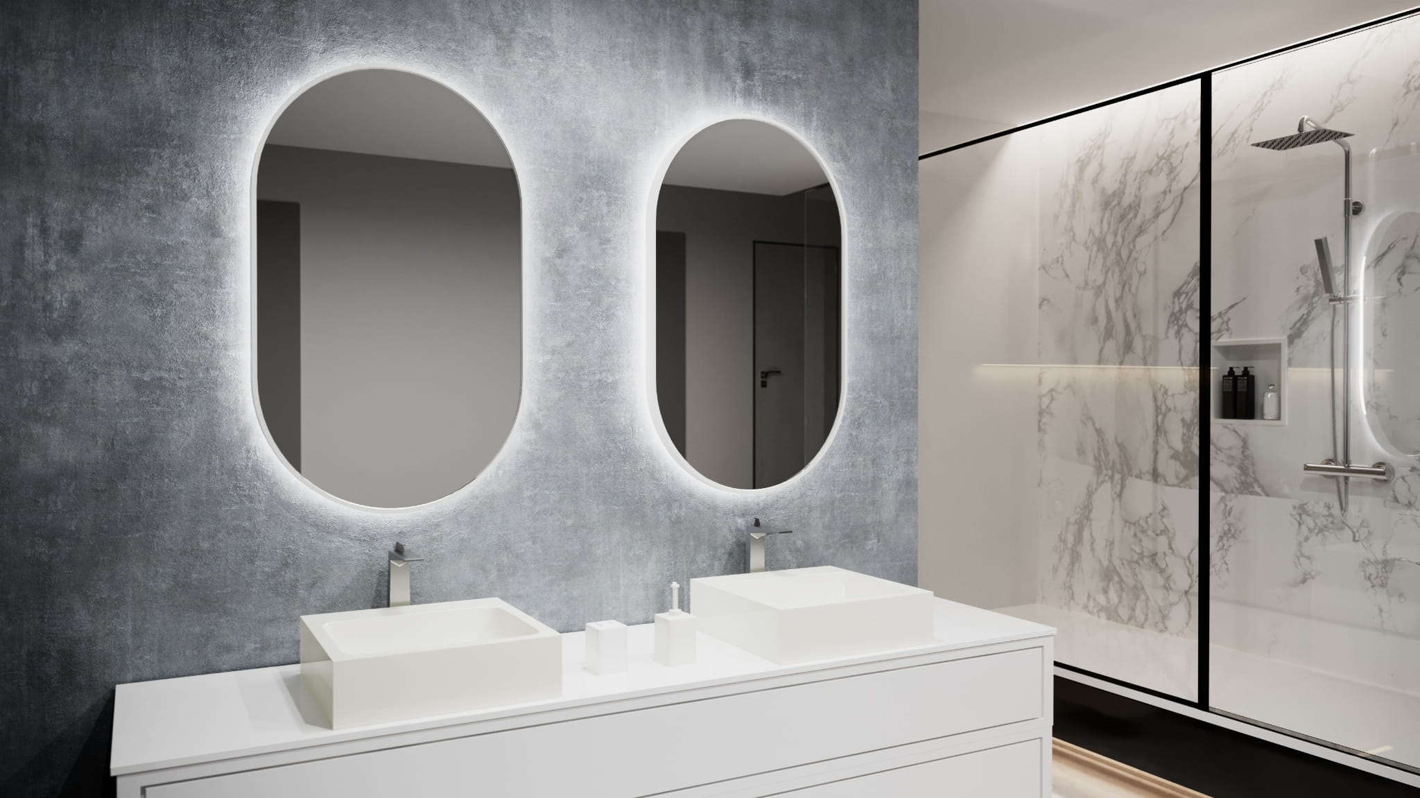 ● dyskretne dotykowe przyciski do luster o konstrukcji z widoczną ramą i regulowaną barwą światła białego