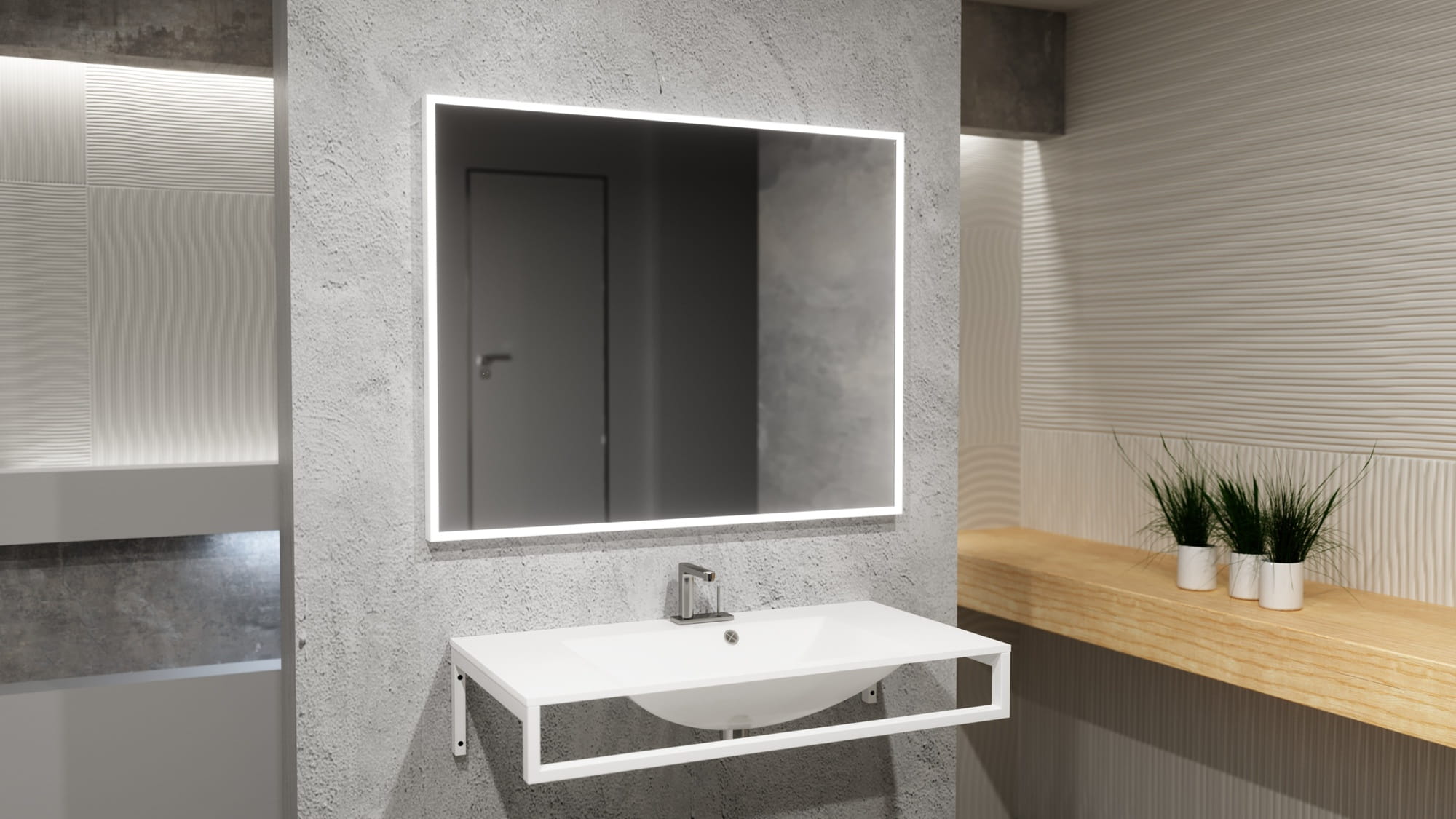Prostokątne lustro Frame osadzone jest w cienkiej, eleganckiej ramce, a pomiędzy nią a taflą znajduje się subtelna szczelina, przez którą przenika światło LED. Efekt tworzy dekoracyjną poświatę na ścianie, podkreślając kształt lustra i nadając wnętrzu nowoczesny, minimalistyczny charakter. FRAME łączy funkcjonalność z estetyką, sprawdzając się doskonale w łazienkach, garderobach i stylowych przestrzeniach mieszkalnych.