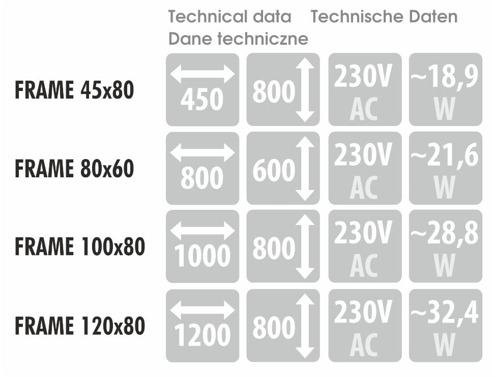 ● przełącznik umieszczony za taflą lustra reaguje na dotyk palcem w podświetlony przycisk; z funkcją automatycznego wyłączenia maty po 45 minutach
