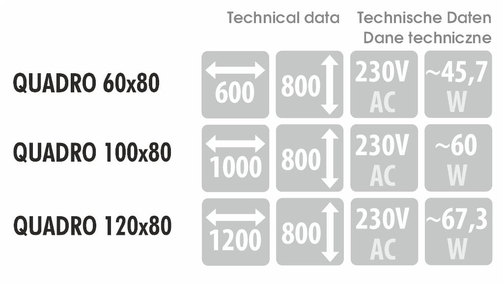 ● przełącznik umieszczony za taflą lustra reaguje na dotyk palcem w podświetlony przycisk; z funkcją automatycznego wyłączenia maty po 45 minutach