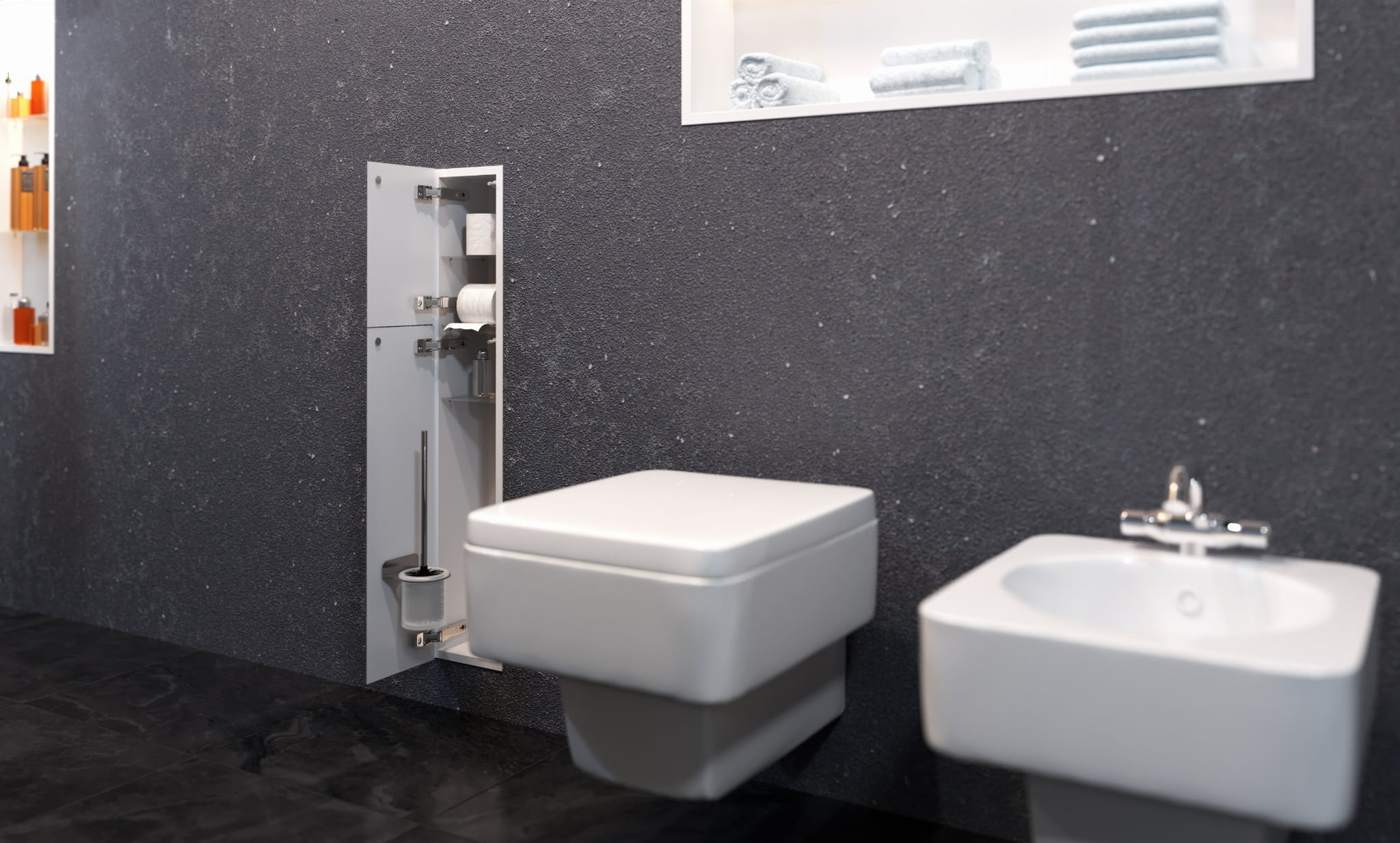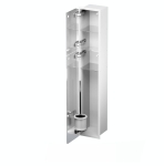 Biały schowek wnękowy WC z białymi drzwiami w połysku to eleganckie i praktyczne rozwiązanie do zabudowy w ścianie. Pozwala dyskretnie przechowywać szczotkę i zapas papieru toaletowego, oszczędzając miejsce w łazience. Całość wykonana jest ze stali nierdzewnej. Drzwi otwierane w lewo (DIN L). W zestawie znajduje się szczotka z kielichem.