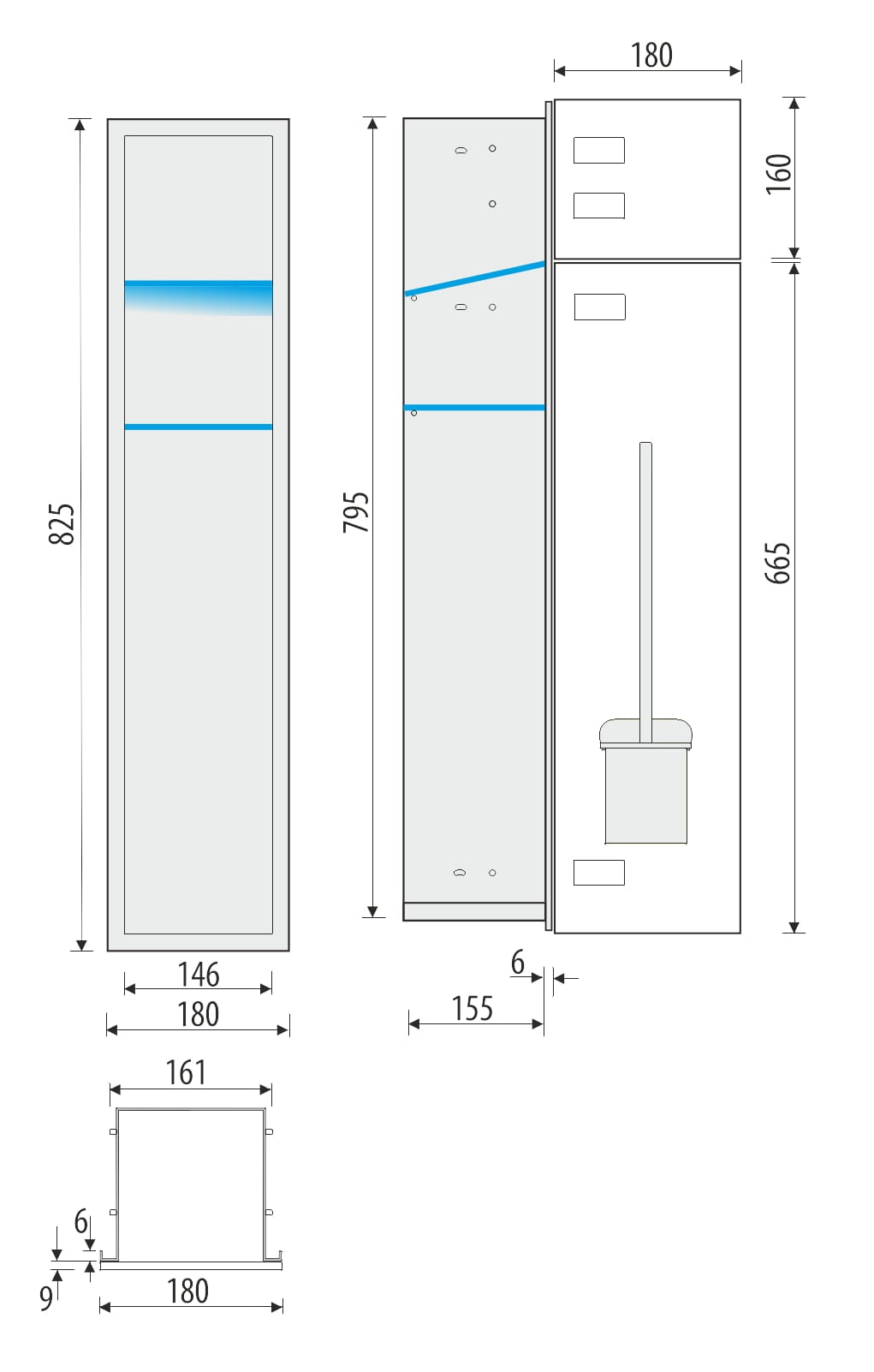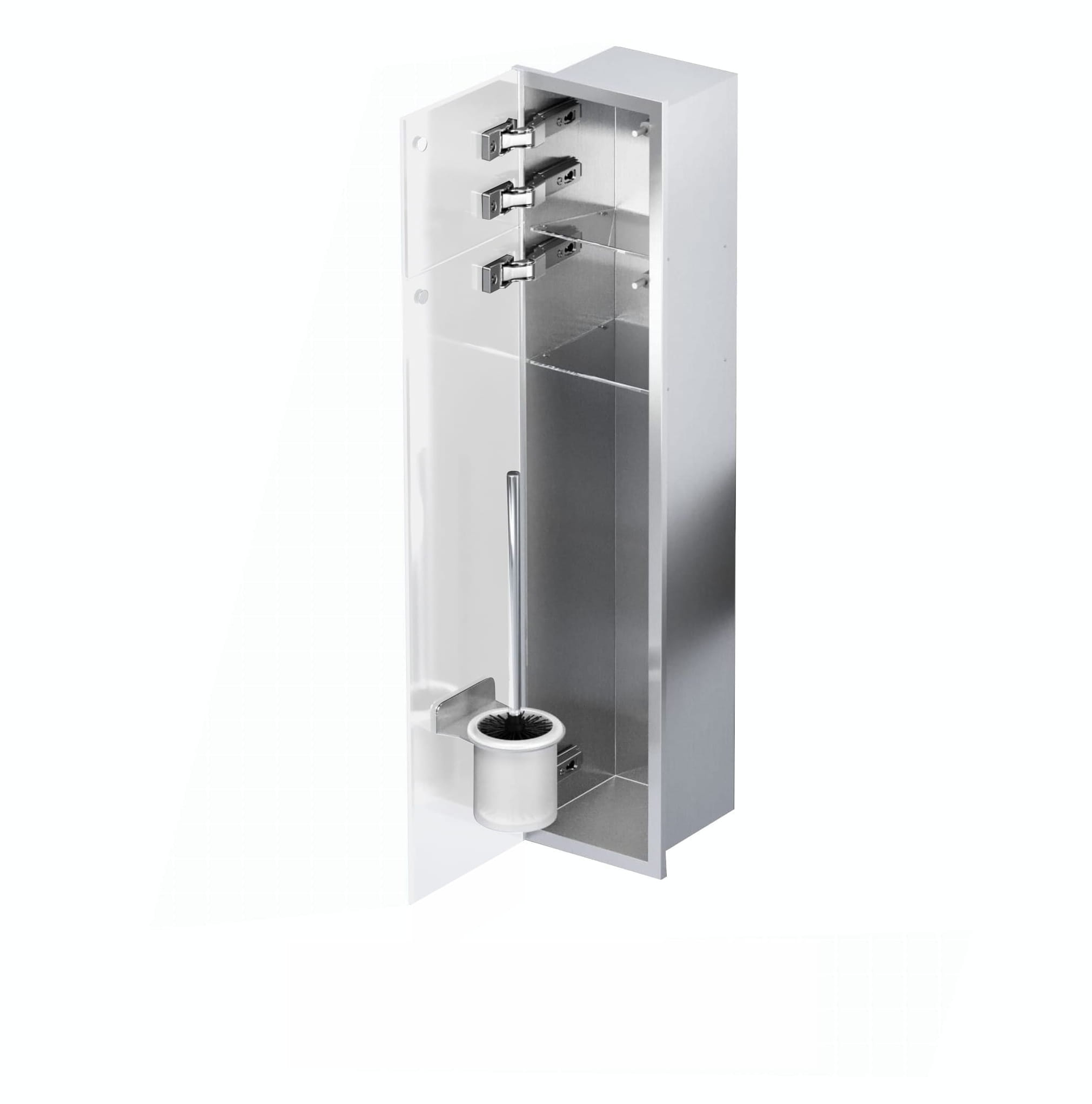 Stalowy schowek wnękowy WC z białymi drzwiami w połysku to eleganckie i praktyczne rozwiązanie do zabudowy w ścianie. Pozwala dyskretnie przechowywać szczotkę i zapas papieru toaletowego, oszczędzając miejsce w łazience. Całość wykonana jest ze stali nierdzewnej. Drzwi otwierane w lewo (DIN L). W zestawie znajduje się szczotka z kielichem.