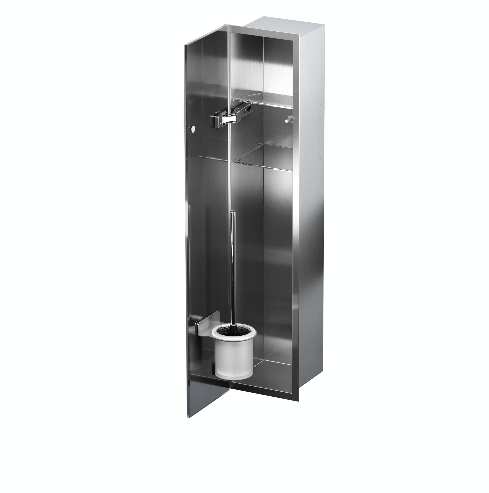 Stalowy schowek wnękowy WC z szarymi drzwiami w połysku to eleganckie i praktyczne rozwiązanie do zabudowy w ścianie. Pozwala dyskretnie przechowywać szczotkę i zapas papieru toaletowego, oszczędzając miejsce w łazience. Całość wykonana jest ze stali nierdzewnej. Drzwi otwierane w lewo (DIN L). W zestawie znajduje się szczotka z kielichem.