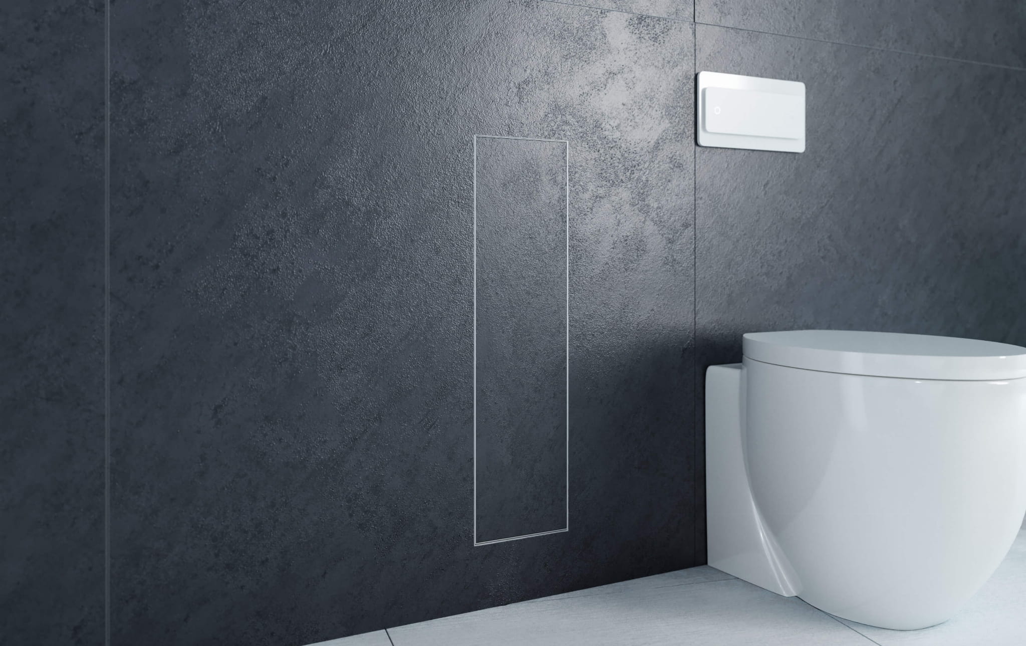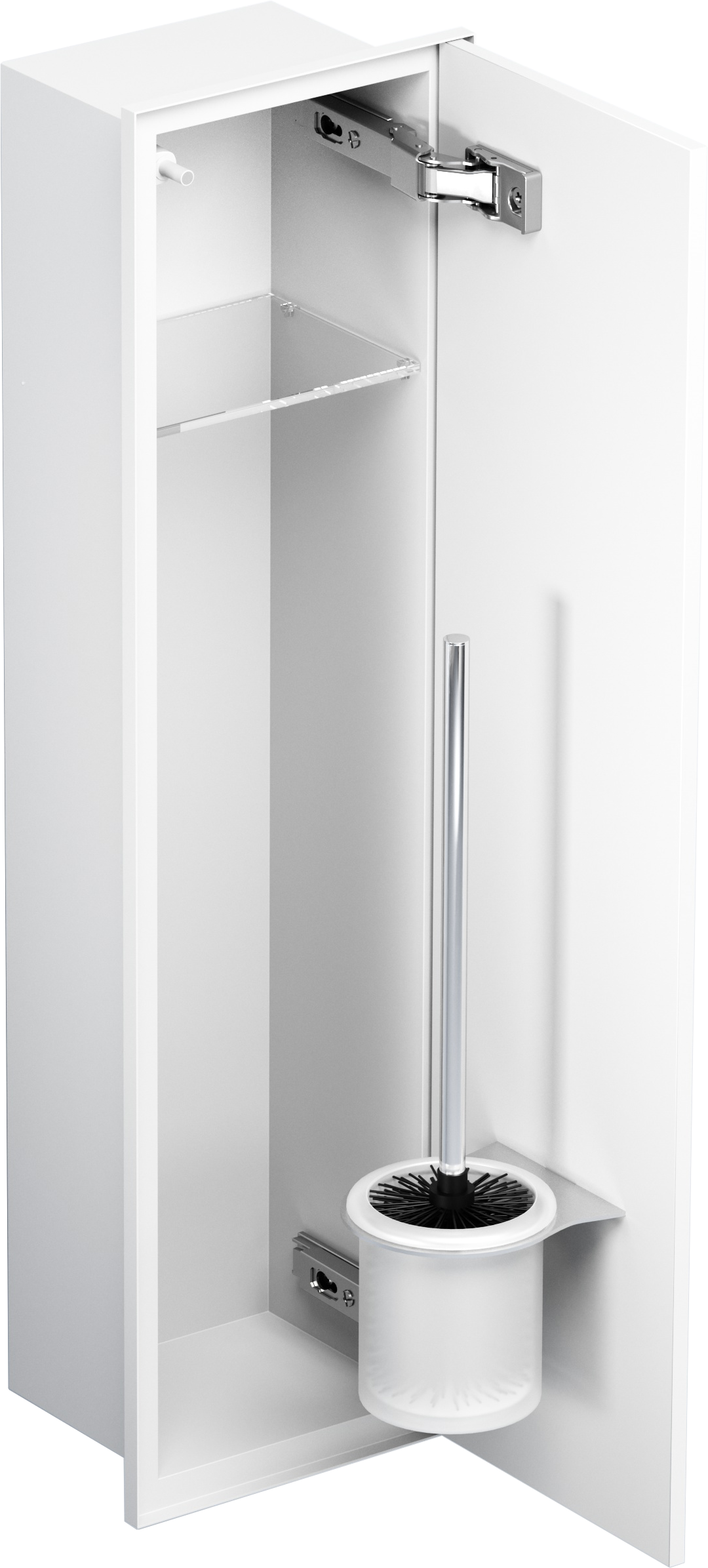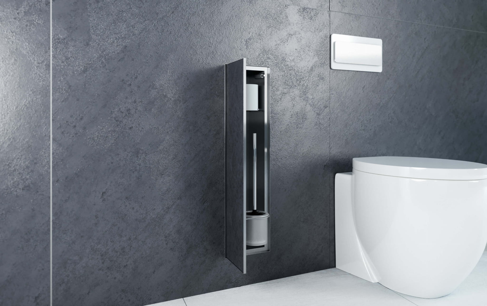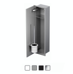 - Dyskretny schowek na szczotkę WC i bieżący papier toaletowy, całkowicie zlicowany ze ścianą