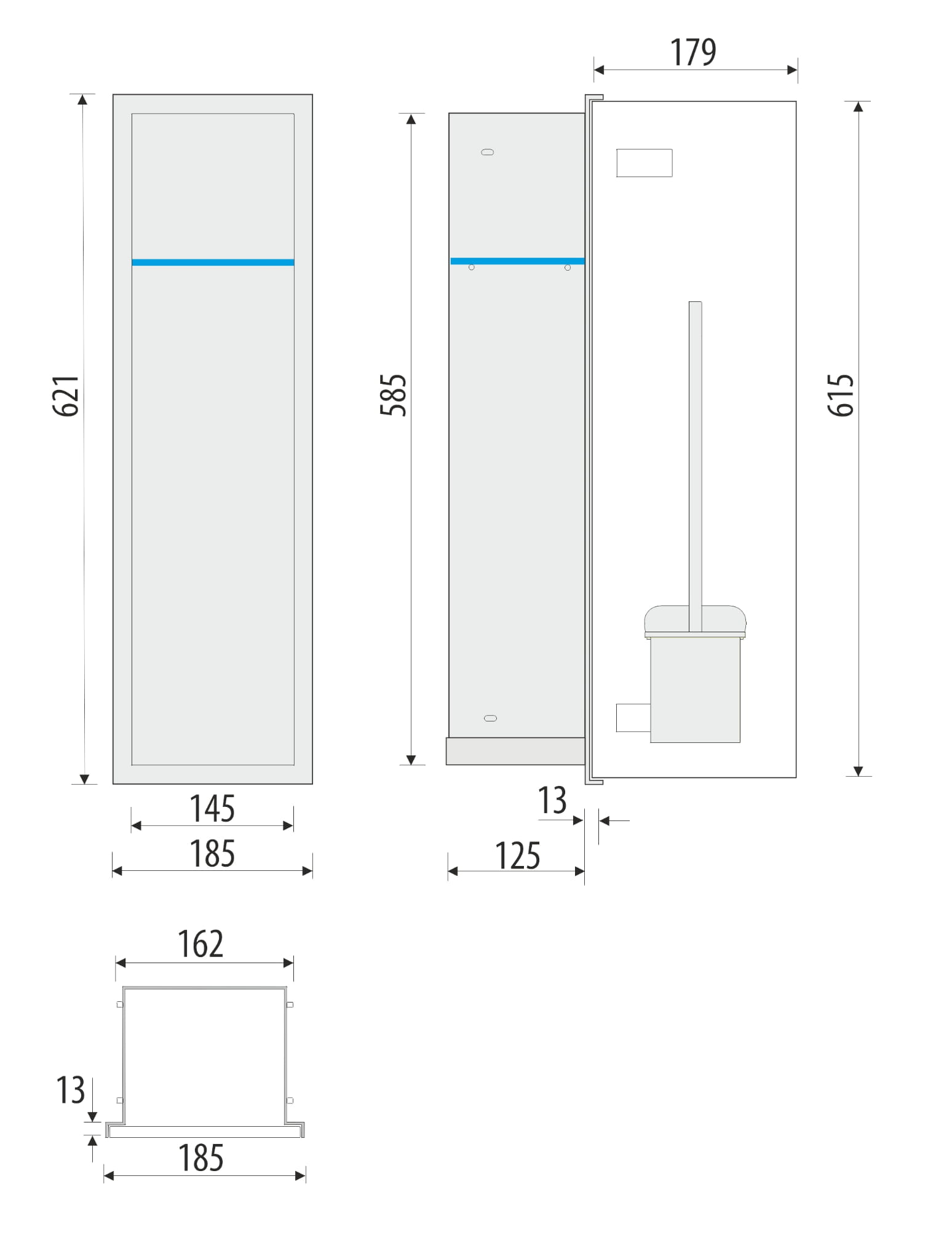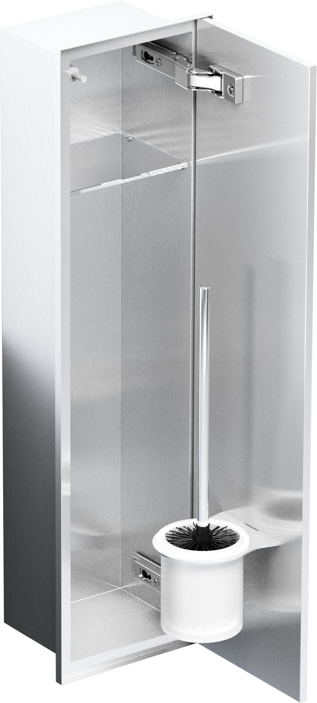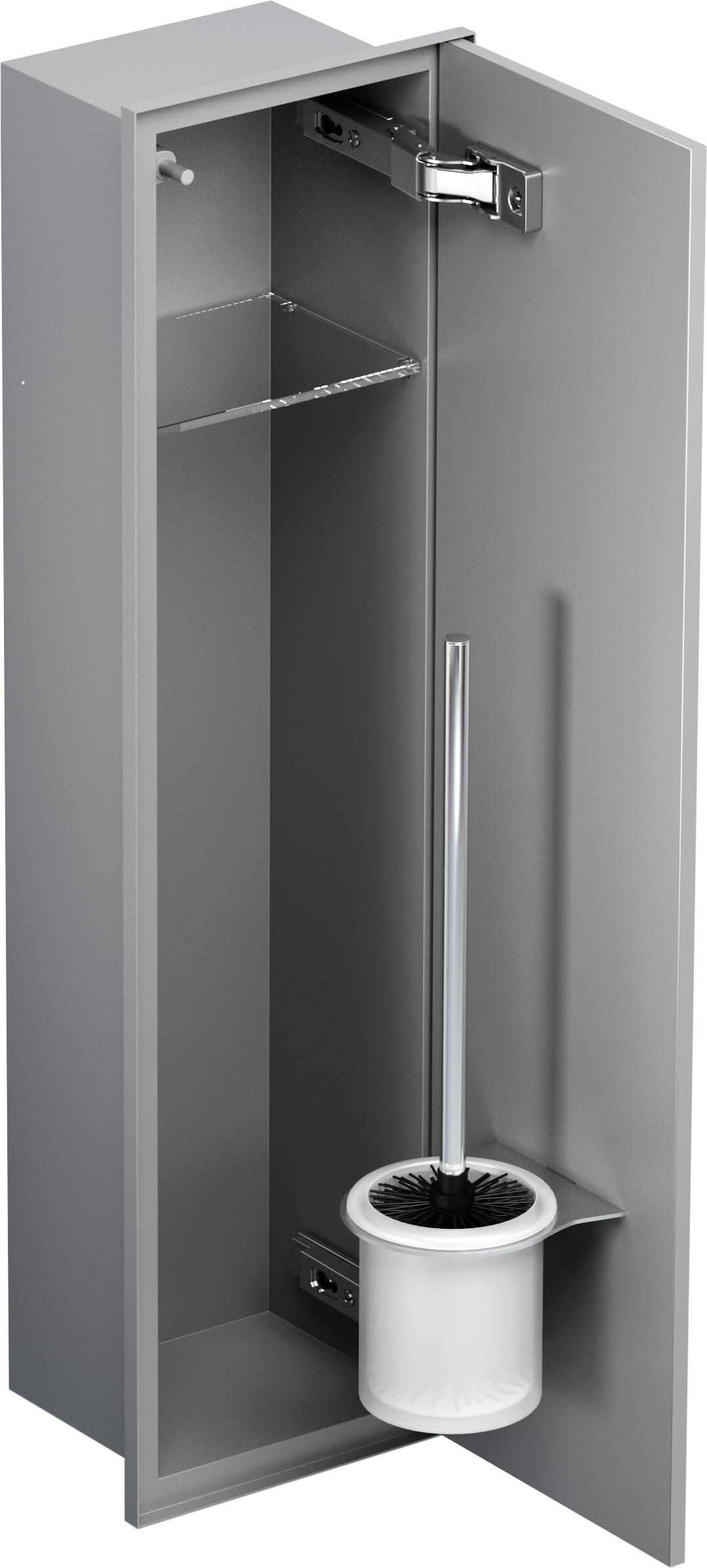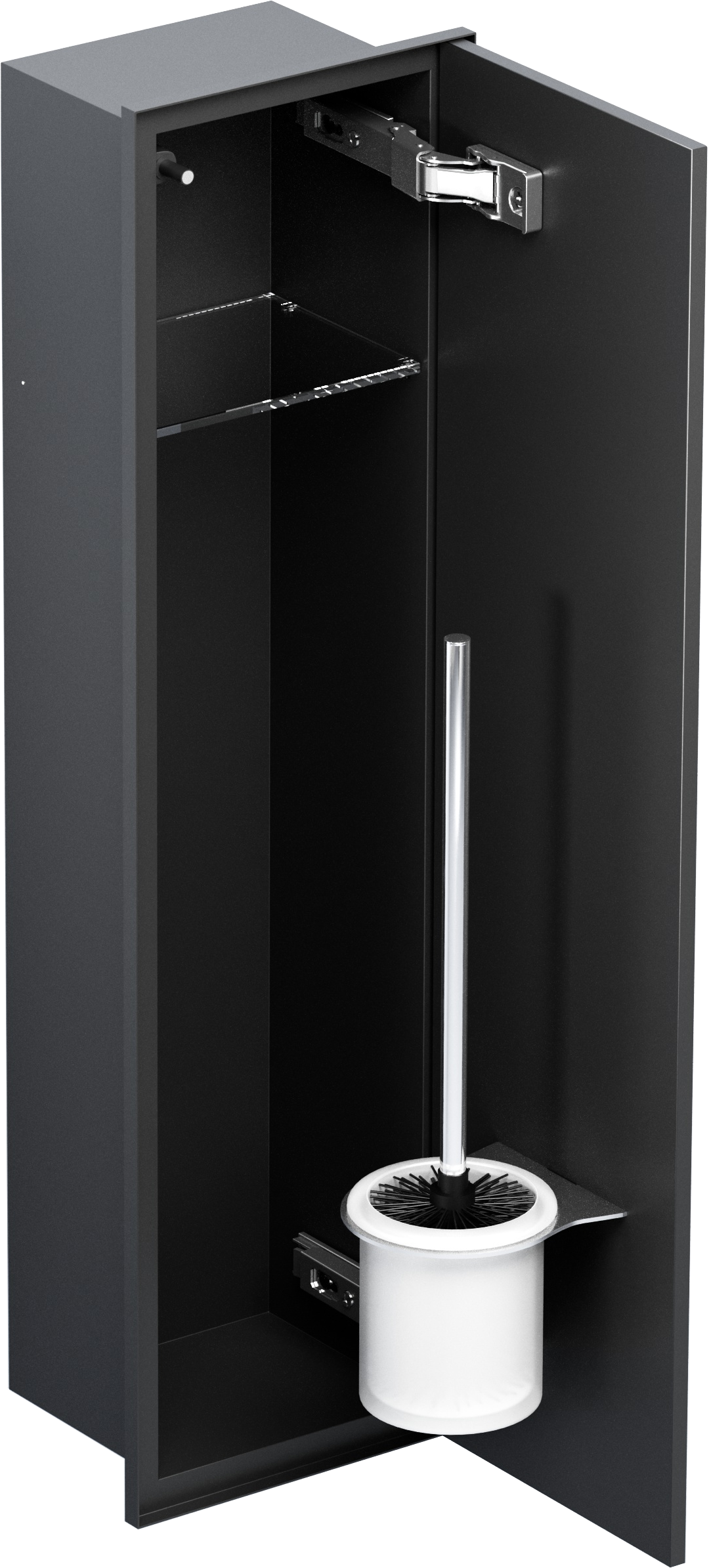 - Dyskretny schowek na szczotkę WC i bieżący papier toaletowy, całkowicie zlicowany ze ścianą